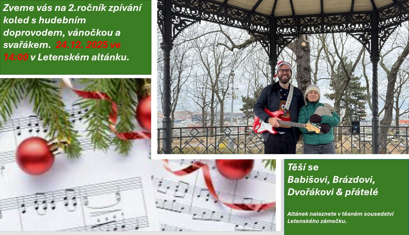 Setkáváme se na veřejném zpívání vždy 24.12. v Praze na Letné , kam si s námi můžete přijít zazpívat tradiční vánoční koledy i Vy.
